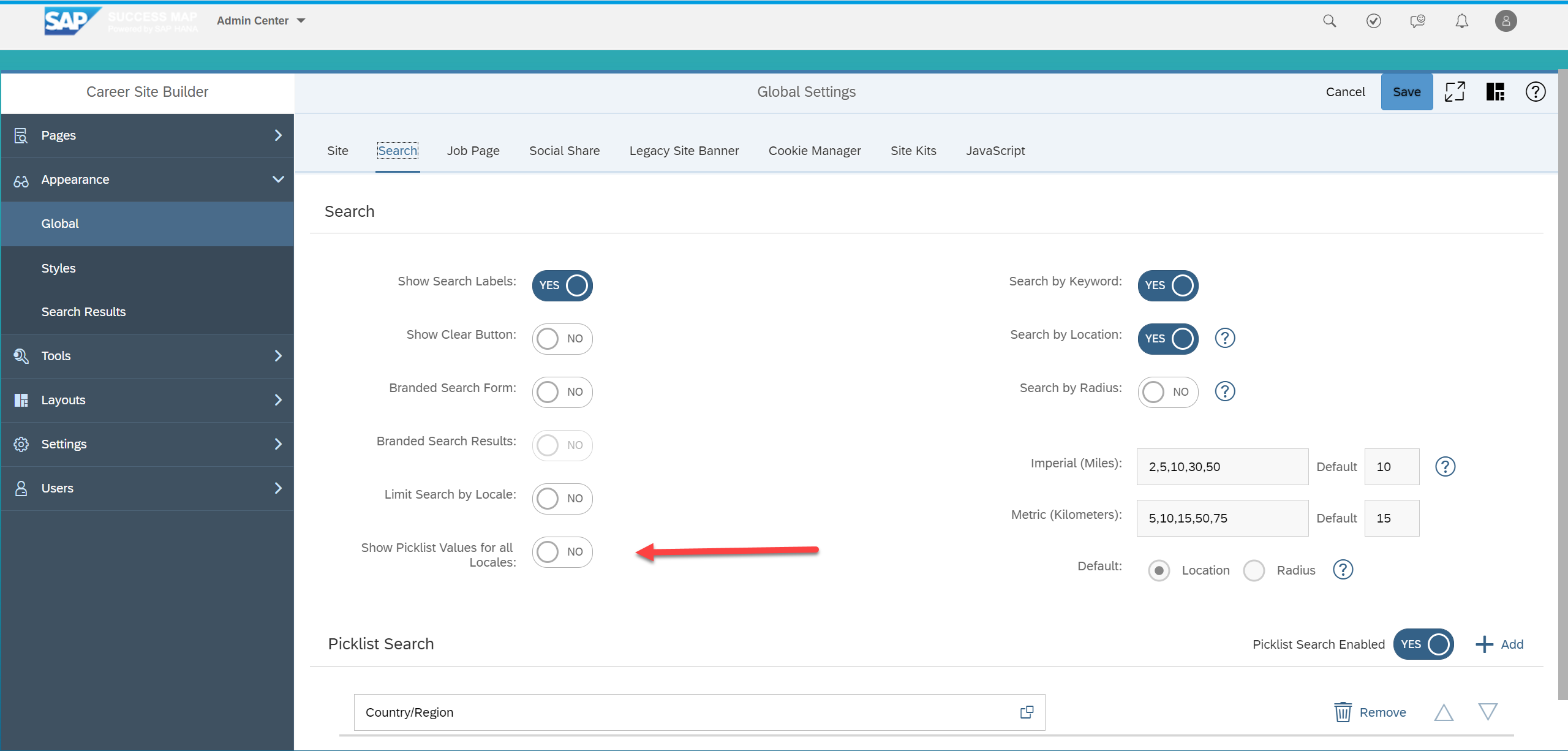 To disable this option, go to Manage Career Site Builder > Appearance > Global > Search tab. Toggle the Show Picklist Values for all Locales.