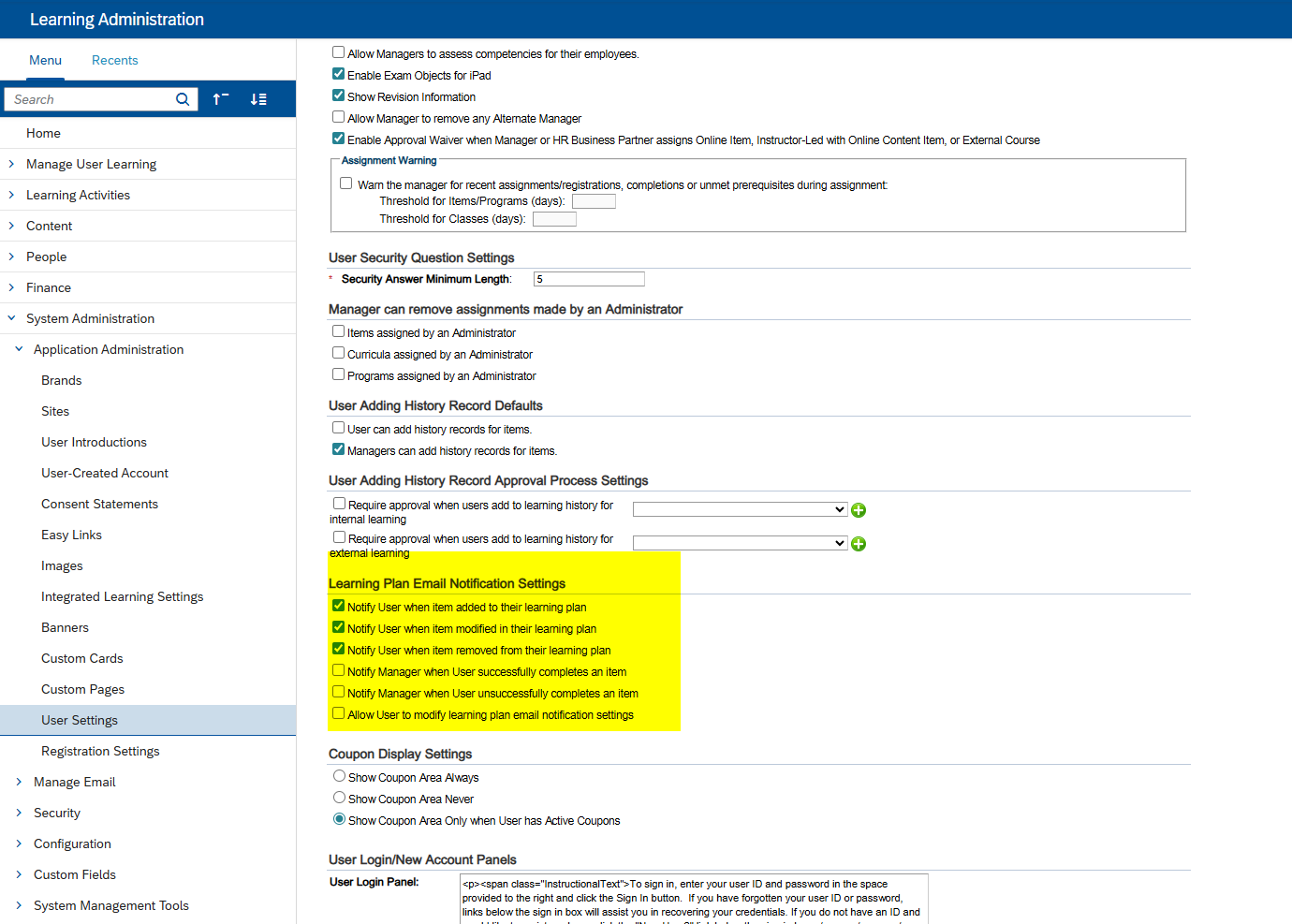 • Notify user when item modified in their learning plan: If you select this checkbox, the system notifies users when an item on their learning plan is modified