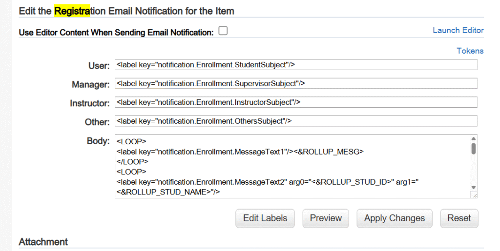 6. Make a backup of the Body and Subject if the Email Notification Template has been modified from the out-of-box version >