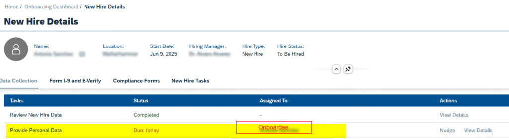 The onboarding process is initiated from RCM or through the transaction “Add New Hire to Onboarding”.