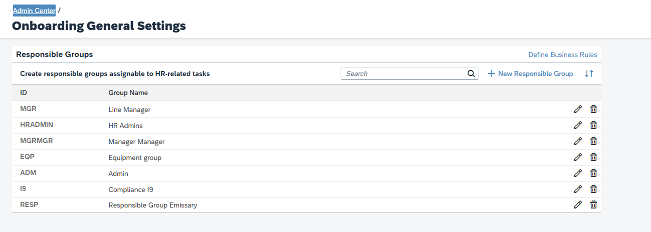 Responsible Groups: the tasks are assigned to the Responsible Groups that are defined at the transaction > “Onboarding General Settings”