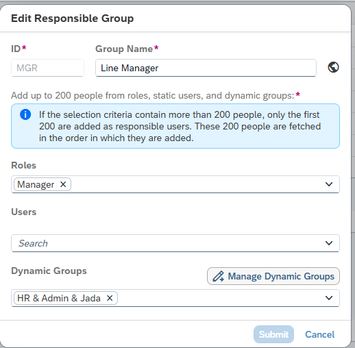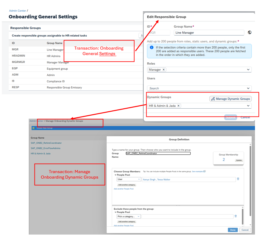 Additionally the Dynamic Groups are special ones, only for Onboarding, and can be managed through the transactions “Â Manage Onboarding Dynamic Groups“