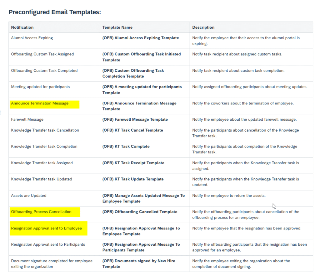 What are some examples of preconfigured Offboarding e-mail templates? Note: There are 3 correct answers to this question.