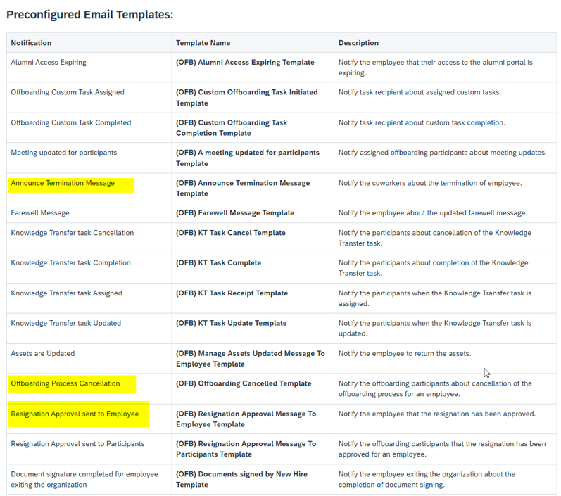 What are some examples of preconfigured Offboarding e-mail templates? Note:There are 3 correct answers to this question.