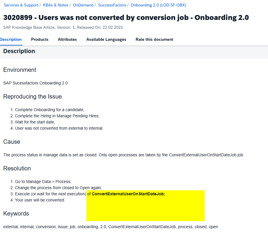 What scheduled job type do you create so new hires become internal users? 1 month ago Corgi Sap 1 minute ○ ConvertExternalUserOnStartDateJob <——— ○ OnStartDateStatusChange ○ External to Internal Candidate Profile Conversion ○ New Hire Export