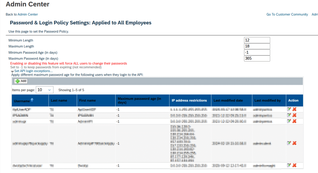 Here, set the Maximum Password Age (in days) to -1 to avoid expiry of the API User from under “Set API login exceptions…“