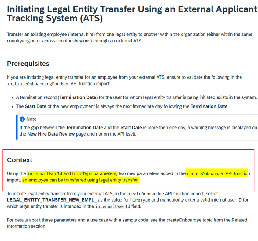 Which parameters in the createOnboardee API function import are used for legalentity transfer? Note: There are 2 correct answers to this question. 4 weeks ago Corgi Sap 1 minute LEGAL_ENTITY_TRANSFER_NEW_EMPL initiateOnboardingforUser internalUserld <————— hireType <———————